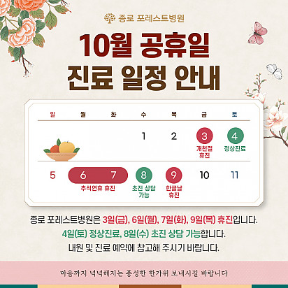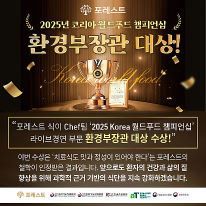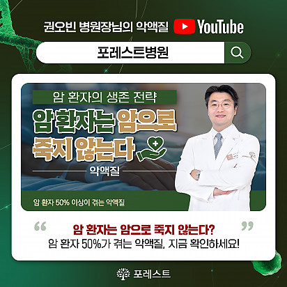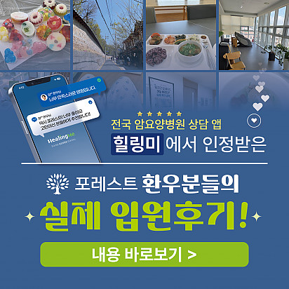 자궁내막암 3기, 박지혜 환우님의 희망일지 ep_1 | 포레스트 환우 이야기 2024.08.08 자궁내막암 3기, 박지혜 환우님의 희망일지 ep_2 | 포레스트 환우 이야기 2024.08.08 자궁내막암 3기, 박지혜 환우님의 희망일지 ep_3 | 포레스트 환우 이야기 2024.08.08 폐암 4기(비소세포암), 서중원 환우님의 희망일지 ep_1 | 포레스트 환우 이야기 2024.08.08 폐암 4기(비소세포암), 서중원 환우님의 희망일지 ep_2 | 포레스트 환우 이야기 2024.08.08 폐암 4기(비소세포암), 서중원 환우님의 희망일지 ep_3 | 포레스트 환우 이야기 2024.08.08 [건강정보] 두통에 도움되는 간단한 지압법 소개드립니다. 안녕하세요, 포레스트입니다! ???? 오늘은 두통에 자주 시달리시는 분들을 위해 하루 1분! 가벼운 두통이 있을 때 하면 … 2025.12.10 12월 종로 포레스트 힐링프로그램 12월 포레스트 힐링프로그램을 소개합니다. 반짝이는 12월, 크리스마스의 기쁨이 가까워지고 있습니다. 차가운 겨울바람 … 2025.12.02 [건강정보]독감, 감기와 달라요! 감기와 독감, 비슷해 보여도 원인·증상·진행 속도 모두 다르다는 사실 알고 계셨나요? 이번 영상에서는 두 질환의 차이를 딱 … 2025.11.25 암환자의 절반 이상이 겪는 숨은 적 '악액질' 암 환자의 절반 이상이 겪는 숨은 적, ‘악액질’. 단순히 살이 빠지는 문제가 아니라, 근육이 소모되고 체력이 급격히 떨어지… 2025.11.13 포레스트 항암식이팀, 2025 코리아 월드푸드 챔피언십 환경부장관상(대상) 수상! 두구두구두구 포레스트 식이 Chef팀이 2025 Korea World Food Championship 라이브경연 부문에서… 2025.11.04 Hot 종로 포레스트 10월 힐링프로그램 10월 힐링프로그램을 소개합니다! 여러분 풍성한 한가위 연휴 잘 보내셨나요? 선선한 바람이 불어오는 10월, 한층 깊… 2025.10.14 Hot 자연이 주는 보약, 제철 식단 자연이 주는 보약, 제철 식단 가을에 나는 음식은 가을에 먹어야 합니다. 가장 영양이 풍부한 제철 식재료로 몸… 2025.10.10 Hot 힐링미 앱의 종로 포레스트 입원 환우 후기 전국 암요양병원 상담 앱 힐링미에서 인정받은 포레스트 입원 환우 후기 포레스트는 환자 한 분, 한 분의 이야기에 귀 기… 2025.10.02 Hot 포레스트 10월 휴진 안내 포레스트 10월 휴진 안내 안녕하세요, 포레스트입니다 다가오는 10월 종로점 휴진 일정을 미리 알려드리오니 … 2025.09.22 12345 Search 검색대상 제목 내용 제목+내용 회원아이디 회원아이디(코) 글쓴이 글쓴이(코) 검색어 필수